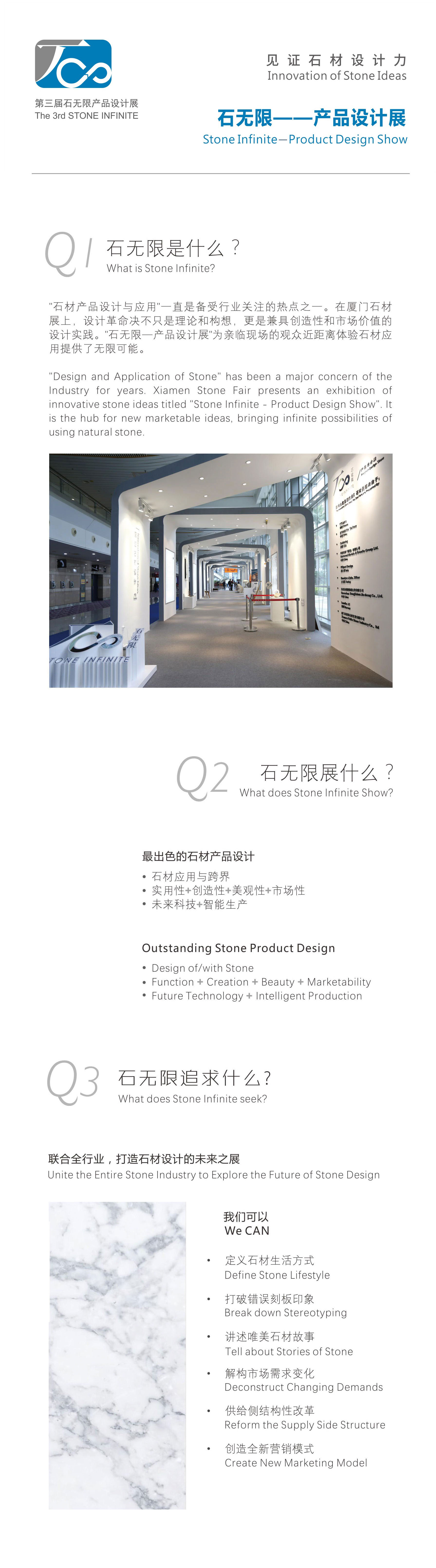 石无限设计展,不只是理论和构想,更是好设计便是好生意的一种理念的实践。石无限设计展不仅为观众提供了场景的体验,还展示了石材应用的无限可能。2020年,第三届石无限设计展将在鹭江厅举办。我们邀请到了中国当代著名的家具设计师与策展人小杰为“石无限设计展”策展人,香港著名的平面设计师刘小康作为“石无限设计展”的平面视觉设计顾问,鼎立雕刻集团创始人艺术总监、当代石雕艺术家王向荣担任艺术顾问。无限的融合,组成了无限的可能。
